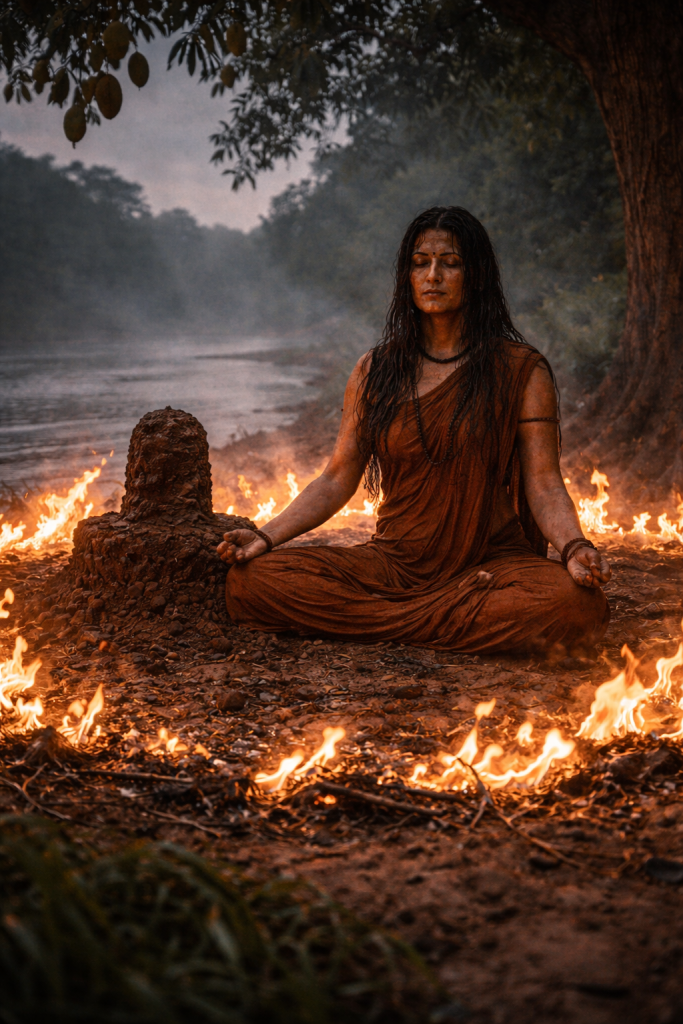 Shiva, ever the great teacher, was not yet ready to accept her devotion without testing it. He sent a divine fire to disrupt her meditation. The flames threatened to consume everything around her—including the precious sand Lingam she had made.